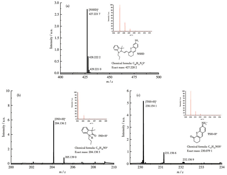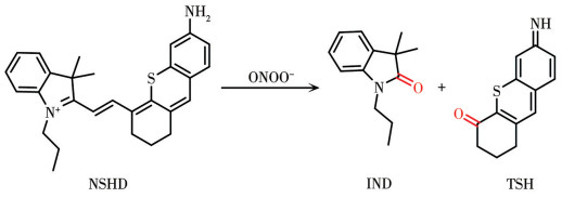 为了从分子层面揭示识别机制,我们用HRMS技术研究了探针NSHD对ONOO-的响应机理。如图 8a所示,探针NSHD的分子离子峰位于m/z= 427.221 7处,在ONOO-加入后,质谱图出现了显著变化,探针的分子离子峰消失,同时在m/z为204.136 2和230.154 1处出现新的分子离子峰,这些峰可以分别指认为[IND+H] +和[TSH+H] +(图 8b和8c)。据此,我们推测探针分子在ONOO-的作用下发生了氧化裂解。探针中的吲哚盐与硫杂蒽通过碳碳双键相连,而ONOO-作为一种活性氮物种,与探针发生氧化反应,导致双键两头都发生了断裂。图 9显示了探针NSHD与ONOO-可能的响应机理。这一结果不仅为理解探针的响应行为提供了分子层面的解释,也为设计新型的活性氮/氧物种探针提供了重要的参考。