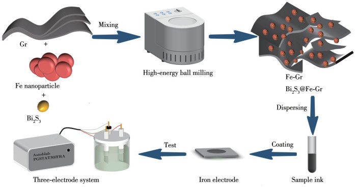 In this work, the mixtures of Fe nanoparticles, graphite (Gr), and bismuth trisulfide (Bi2S3) were first subjected to the high-energy ball milling treatment to fabricate corresponding iron electrodes (Bi2S3@Fe-Gr). During the ball milling process, the weakening of interlayer forces in Gr leads to an increase in the dispersity and real surface area of Gr, which is conducive to the uniform dispersing of Fe and Bi2S3 particles and their firm immobilization on Gr. In addition, Fe particles, as electro-active species, are effectively coated with the fragmented Gr, which further benefits the stability of the iron electrode. The hydrogen evolution curves and passivation polarization curves of the prepared iron electrodes in different electrolytes (neutral and alkaline) were obtained to investigate their electrochemical performance. Herein, the performances of iron electrodes were studied both in a typical alkaline electrolyte (6 mol·L-1 KOH solution) and a quasi-neutral electrolyte (4 mol·L-1 NH4Cl+1 mol·L-1 KCl solution). Compared with alkaline electrolytes commonly used in metal-air batteries, neutral electrolytes greatly reduce the carbonation of solutions and have relative environmental friendliness. It was found that the prepared iron electrodes exhibited a great impact on inhibiting hydrogen evolution and iron passivation. This can be attributed to the presence of Gr fragments and Bi2S3. This work adopted a simple all-solid-state synthesis method to prepare iron electrodes, which is beneficial for the high efficiency and large-scale preparation of iron electrodes.