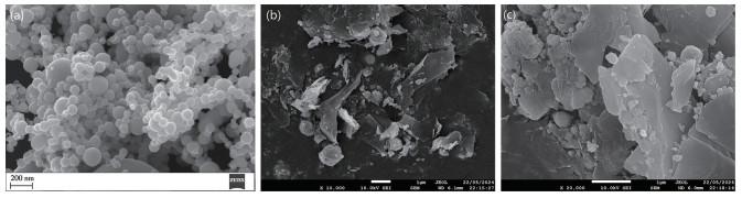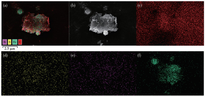SEM images of pure Fe nanoparticles and Bi2S3-3@Fe-Gr are shown in Fig. 2. It was found from Fig. 2a that pure Fe nanoparticles presented a spherical structure, and most particles had a diameter of around 100 nm. For Bi2S3-3@Fe-Gr as indicated in Fig. 2b and 2c, there were lots of disturbed and small fragments due to the high‑energy ball milling treatment. And Fe nanoparticles were immobilized on Gr sheets, retarding their agglomeration. Ball milling reduces the interlayer forces of Gr, which is beneficial for the encapsulation of Fe particles by Gr fragments. It is further found from the elemental mapping images of Bi2S3‑3@Fe‑Gr (Fig. 3) that Fe and Bi2S3 particles were well dispersed on the surface of Gr sheets after the ball milling. Comparison of colors between Fig. 3a and 3f further manifested that most Fe particles were wrapped in carbon.
