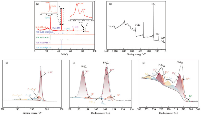 XRD pattern of Bi2S3-3@Fe-Gr is shown in Fig. 4a. Bi2S3-3@Fe-Gr had two distinct diffraction peaks at 44.7° and 65.0°, belonging to the (110) and (200) crystal planes of Fe (PDF No.06-0696)[18], respectively. The diffraction peak at 44.9° corresponds to the (031) crystal plane of FeC (PDF No.06-0686). The diffraction peaks at ca. 82.3° and 82.6° are attributed to Fe and FeC (Inset of Fig. 4a). The diffraction peaks at 26.5° and 54.5° are attributed to the (002) and (004) crystal planes of C, respectively (PDF No.26-1079). The diffraction peak at 35.5° can be ascribed to the (240) crystal plane of Bi2S3 (PDF No.17-0320).
