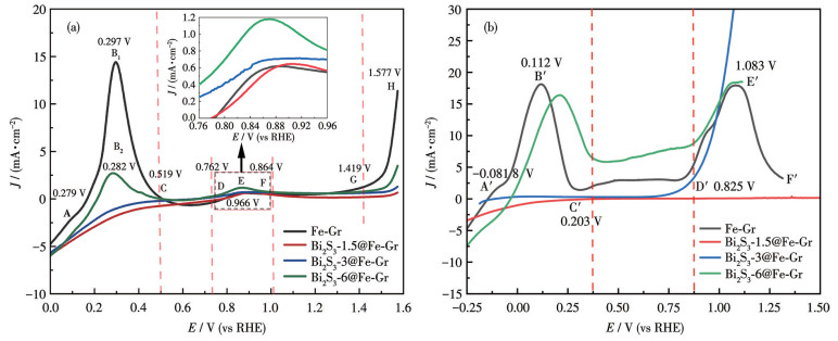 Fig. 5 shows the cyclic voltammetry (CV) curves of four samples in a 6 mol·L-1 KOH solution. It can be seen from Fig. 5a that the oxidation peak of Fe-Gr appeared at the potential of 0.41 Ⅴ, corresponding to the oxidation of Fe into Fe3+. This wide and strong oxidation peak was involved in two possible steps, including the oxidation of Fe to Fe2+ and Fe2+ to Fe3+ [28]. Bi2S3-1.5@Fe-Gr (Fig. 5b) showed an oxidation peak at apotential of 0.79 Ⅴ, which is related to the oxidation of Fe2+ to Fe3+. In addition, a weak oxidation peak at ca. 0.33 Ⅴ (Fig. 5b) may be ascribed to the oxidation of Fe to Fe2+. Fig. 5c indicates that Bi2S3-3@Fe-Gr also exhibited two oxidation peaks at ca. 0.25 and 0.86 Ⅴ, originating from the oxidation reactions of Fe to Fe2+ and Fe2+ to Fe3+, respectively. Considering the alkaline electrolyte applied, Fe2+ and Fe3+ ions exist in the form of Fe(OH)2 and Fe(OH)3, which is more conducive to the oxidation of Fe or Fe2+. The oxidation peak of Bi2S3-6@Fe-Gr (Fig. 5d) occurred at a potential of ca. -0.11 Ⅴ, which may be attributed to the oxidation of Fe to the adsorbed hydroxy iron [Fe(OH)]ads[33]. The subsequent oxidation peak at 0.07 Ⅴ is due to the oxidation of [Fe(OH)]ads to Fe2+. Reactions related to the anodic oxidation of iron electrodes are shown in Eq.2-5[28, 34]: