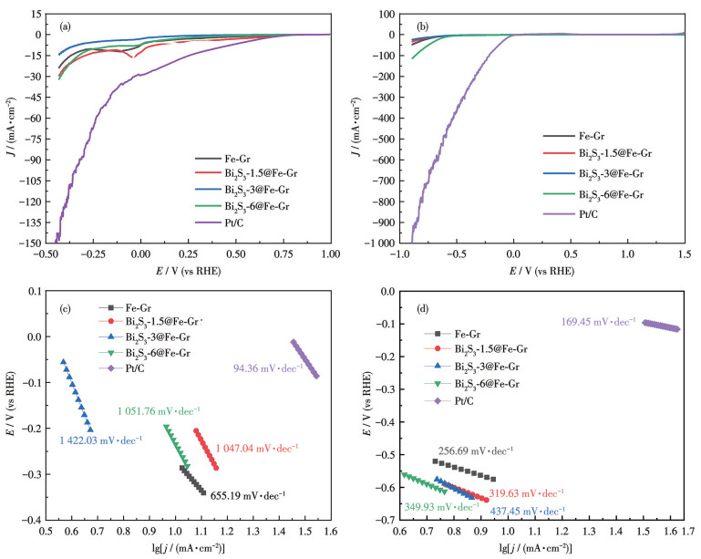 The HER on the prepared Fe-Gr, Bi2S3-1.5@Fe-Gr, Bi2S3-3@Fe-Gr, and Bi2S3-6@Fe-Gr electrodes was further investigated to show the inhibitory effect of Bi2S3 on HER. Results were also compared with the benchmark Pt/C as indicated in Fig. 8. It is observed from Fig. 8 that whether in alkaline (Fig. 8a) or neutral (Fig. 8b) solution, the onset potentials of HER on the prepared samples exhibited a significant shift in a negative direction compared to the Pt/C. Among the prepared samples, however, Bi2S3-3@Fe-Gr presented the best inhibitory effect on hydrogen evolution both in neutral and alkaline media, characterized by the smallest hydrogen evolution current and the most negative hydrogen evolution potential. The Tafel curves extracted from the corresponding LSV curves are shown in Fig. 8c and 8d. In 6 mol·L-1 KOH solution, Pt/C delivered a Tafel slope of 94.36 mV·dec-1, while the prepared samples Fe-Gr, Bi2S3-1.5@Fe-Gr, Bi2S3-3@Fe-Gr, and Bi2S3-6@Fe-Gr showed much higher Tafel slopes of 655.19, 1 047.04, 1 422.03, and 1 051.76 mV·dec-1, respectively. Similar to that in neutral solution, Pt/C also presented the smallest Tafel slope of 169.45 mV·dec-1, as shown in Fig. 8d. And Bi2S3-3@Fe-Gr also had the highest Tafel slope of 437.45 mV·dec-1 compared to other samples Fe-Gr (256.69 mV·dec-1), Bi2S3-1.5@Fe-Gr (319.63 mV·dec-1), and Bi2S3-6@Fe-Gr (349.93 mV·dec-1). The results from Fig. 8 indicate that adding an appropriate amount of Bi2S3 to the iron electrode can effectively suppress hydrogen evolution, whether in alkaline or neutral electrolytes. This would be attributed to the fact that the presence of Bi2S3 is not conducive to the formation of adsorbed hydrogen intermediates on the surface of the iron electrode, thereby increasing the overpotential of hydrogen evolution[27-28, 39]. As for Bi2S3-6@Fe-Gr with a high Bi2S3 content, on the contrary, it presented a poorer inhibitory performance on hydrogen evolution than Bi2S3-3@Fe-Gr. This would be ascribed to the formation of more FeS on the Bi2S3-6@Fe-Gr, which may facilitate the adsorption of hydrogen species on the electrode surface, thereby reducing the overpotential of HER. However, the influence of the amount of Bi2S3 added to the specific mechanism of inhibiting hydrogen evolution in different electrolyte solutions still needs to be further studied. Results show that when the Bi2S3-3@Fe-Gr is applied to the IAB as an anode, the corresponding battery will exhibit excellent stability in the idle state and higher charging efficiencies.