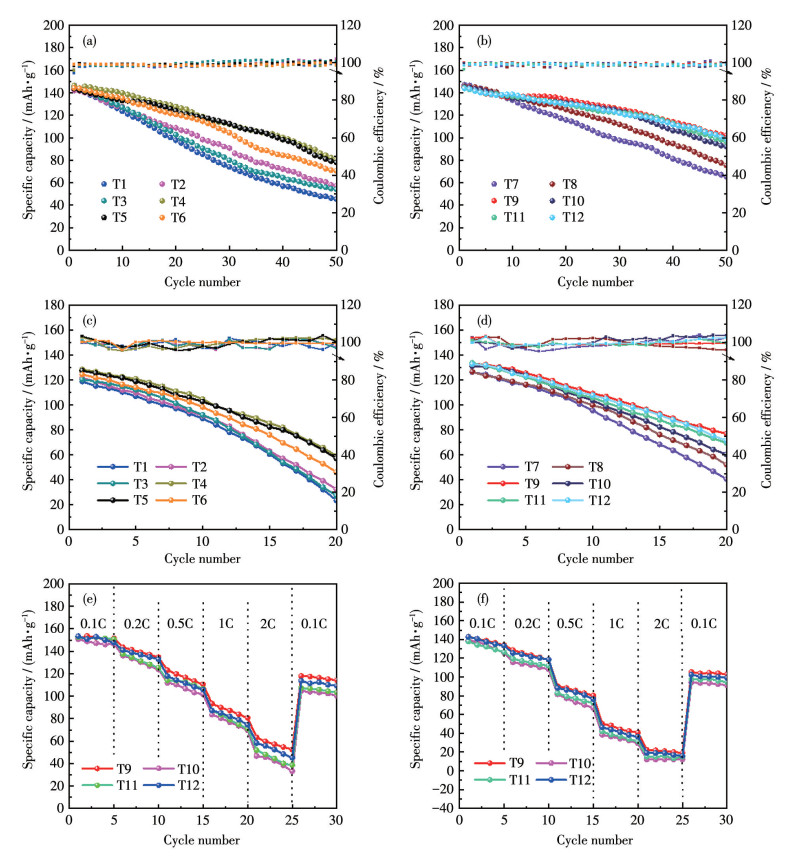 为评估该T9配方的有效性,对不同配方电解液的电化学性能进行了探索。电池测试分别在-20和-40 ℃下实施,如图 1a~1d所示。由图可知,多种添加剂的使用可以显著提高电池在低温条件下的电化学性能。在-20 ℃的条件下,T9电解液的首圈放电比容量为144.65 mAh·g-1,循环50圈后仍保持在102.31 mAh·g-1,容量保持率为70.7%。在-40 ℃条件下,T9电解液的首圈放电比容量为133.05 mAh·g-1,20个循环后仍保持在76.89 mAh·g-1,容量保持率为57.8%。在-20和-40 ℃条件下,T9电解液均展示出了较好的循环稳定性。这说明T9电解液能够提供更高的锂离子传输速率,这有利于锂离子的迁移,进而能够提供更优的低温性能。另外,通过分析库仑效率可以看出,库仑效率越高,电池在每个充放电循环中损失的容量越小,这表明T9电解液的使用减少了低温循环中锂离子的损失,从而增加了电池的循环寿命。T1~T12在低温下的容量保持率见表S3。