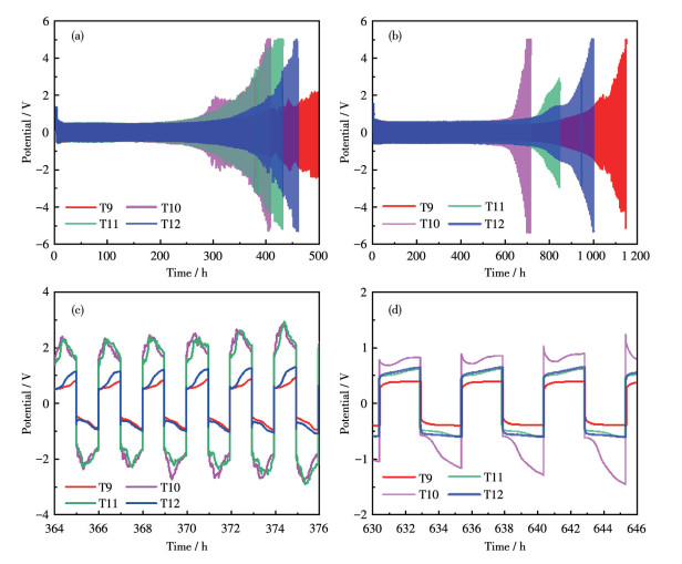 图 1结果可知,使用T9~T12电解液制备的电池在低温下的性能更佳。为了进一步了解电解液的循环稳定性,对T9~T12电解液的极性进行测试。由图 2的极性测试结果可知,T9电解液对应电池的电压曲线表现得相对平滑;相比之下,T10电解液对应电池的电压在-20 ℃下能维持约300 h,-40 ℃下能维持约650 h,并且电压存在较大波动,极性表现最差;而T11、T12电解液对应电池的电压循环稳定时间稍长,二者在-20 ℃的极化电压分别出现在350、800 h处,-40 ℃的极化电压分别出现在400、900 h处;T9电解液对应的电池在电压稳定性方面表现出色,其在-20、-40 ℃下的电压稳定时间最长,分别约为500和1 100 h。实验中观察到的电池极化现象与电极表面产生死锂及CEI膜不断增厚导致的内阻增大密切相关[20]。以上结果说明以VC+PS+FEC作为多元添加剂可以促进更薄、更稳定的CEI膜生成,从而提高电池在低温下的循环稳定性。