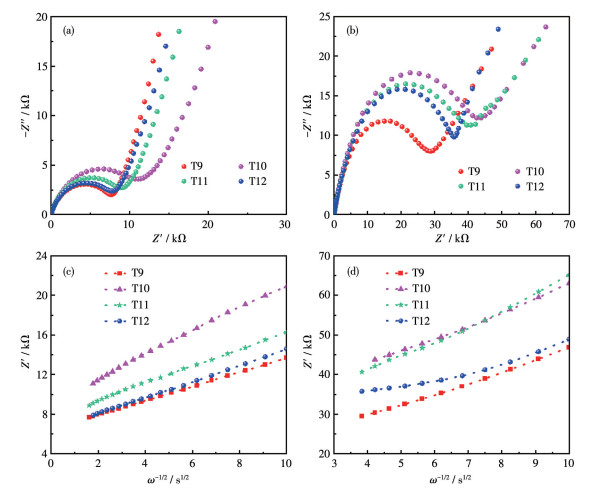 Figure 3  EIS at (a) -20 ℃ and (b) -40 ℃ and Z'-ω-1/2 curves at (c) -20 ℃ and (d) -40 ℃ of LCO||Li batteries prepared using different electrolytes