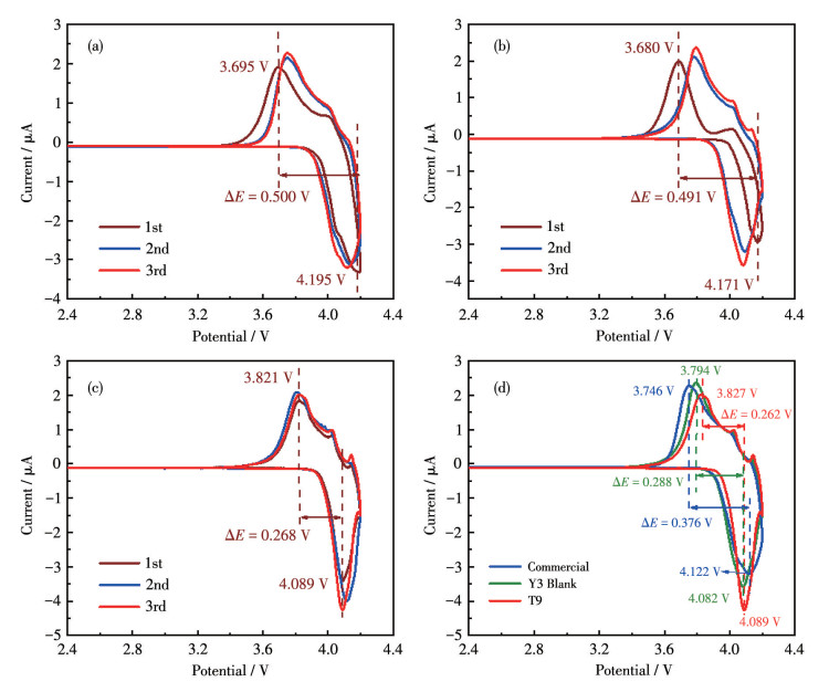 Figure 4  CV curves of the batteries prepared with (a) commercial, (b) Y3 Blank, and (c) T9 electrolytes at room temperature; (d) Comparison of the 3rd CV curves of the batteries at room temperature
