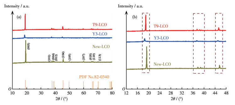 Figure 7  (a) XRD patterns and (b) corresponding magnified patterns of the commercial LCO cathode and LCO cathode from the batteries prepared with Y3 Blank and T9 electrolyte after cycling at -40 ℃