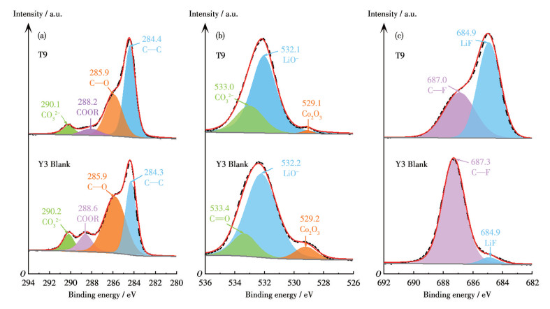由XPS全谱图(图S2)可知,经过循环后T9和Y3 Blank电解液对应的LCO正极中均出现F1s、O1s、C1s的峰,表明正极表面存在氟化物及碳酸盐分解生成的含C、O元素的化合物,尤其是前者的F1s峰强度有了明显的提升,这表明含F化合物是构成电极CEI膜的主要成分。与此同时,前者的O1s、C1s峰强度降低,说明碳酸盐产物的量有所下降。另外,XPS全谱图中还显示出微弱的S2p峰,说明CEI膜中存在少量的含硫化合物。