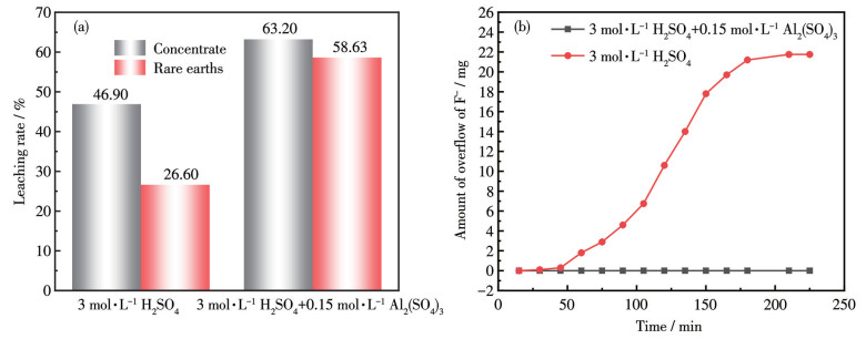 对比研究了3 mol·L-1 H2SO4溶液和3 mol·L-1 H2SO4+0.15 mol·L-1 Al2(SO4)3的混合溶液对包头混合稀土精矿的浸出效果。图 2展示了碱吸收液中F-含量随时间的变化曲线,以及精矿和稀土的浸出率的对比结果。结果表明,Al2(SO4)3的引入有效促进了氟碳铈矿的分解。当Al2(SO4)3浓度达到0.15 mol·L-1时,精矿浸出率由46.9%显著提升至63.2%,提升了16.30个百分点;而且Al2(SO4)3的引入对稀土的浸出强化效应更为突出,稀土浸出率提高了32.03个百分点,充分体现了Al2(SO4)3对稀土选择性浸出的强化作用。