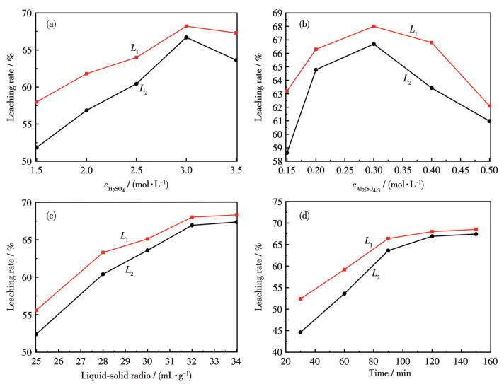 为了确定H2SO4-Al2(SO4)3浸取氟碳铈矿的最佳条件,采用100目的包头混合稀土精矿,在搅拌速度为200 r·min-1和反应油浴温度为135 ℃的条件下,分别研究了H2SO4浓度、Al2(SO4)3浓度、液固比、反应时间等条件对L1和L2的影响,结果如图 3所示。