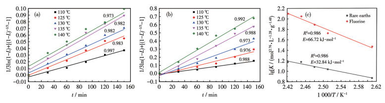 图 5的动力学曲线经拟合后的线性相关系数都大于0.97,呈现比较好的直线关系,说明此动力学模型可以用来描述稀土与F-浸出的动力学过程。根据阿伦尼乌斯方程8,两边取对数可得图 5c所示lg k-1 000/T曲线,曲线的斜率即为活化能,计算得到的稀土和F-浸出过程的活化能分别为32.84和66.72 kJ·mol-1。相较于Zhang等[26]提出的HCl-AlCl3体系,在本体系中,稀土浸出的活化能变化不明显,但F-浸出的活化能有显著提高。基于此,可以通过提升温度来提高浸取率。