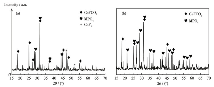 表 1 原矿及H2SO4-Al2(SO4)3体系浸出渣中各组分的质量分数Table 1. Mass fraction of each component in raw ore and leaching residue by H2SO4-Al2(SO4)3 system% Composition F P Ca Acid soluble MxOy Acid insoluble MxOy Raw ore 9.40 3.78 8.21 39.39 13.42 Leaching residue 1.64 6.93 0.22 16.22 39.21 混合稀土精矿与浸出渣的XRD如图 6所示。稀土精矿的物相主要是氟碳铈矿(CeFCO3)(PDF No.11-0340)、独居石(MPO4)(No.46-12959)以及萤石(CaF2)(PDF No.35-0816)。经H2SO4-Al2(SO4)3浸取后的反应渣中,萤石的物相已经消失,更多独居石的峰开始出现且变得更强,而氟碳铈矿的峰强降低甚至消失。说明萤石和大部分的氟碳铈矿已基本分解完全。尽管渣中还有少量氟碳铈矿,但可通过将反应时间延长至3 h,或将液固比提高至42 mL·g-1,以使氟碳铈矿完全浸出。据相关报道,在独居石进行碱分解焙烧前,添加少量含氟化合物(如萤石等),可使独居石在800~825 ℃时完全分解,而在不添加氟化物的同等条件下,其分解率不超过98%[2]。焙烧后的烧结物不易溶于无机酸,但加入氟化物时则溶于HCl。因此,保留少量氟碳铈矿对后续独居石的碱分解是有益的。