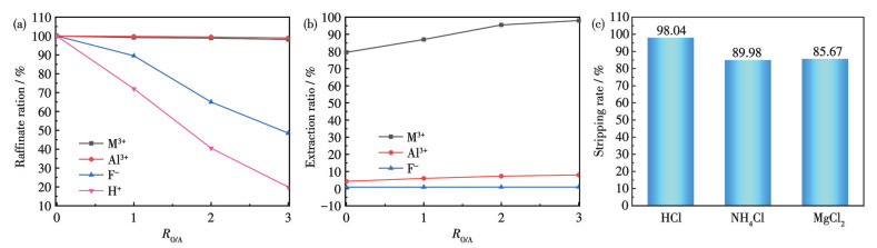 表 2 萃取稀土时共存离子的测试结果Table 2. Test results of coexisting ions during the extraction of rare earth elementsElement Mass concentration / (mg·L-1) Extraction rate / % Strpping rate / % Leachate Raffinate of TIOA Raffinate of N1923 Stripping solution M 6 702 6 689 175 6 387 97.38 98.05 Al 15 754 15 747 14 392 54 8.61 0.06 Th 0.995 0.994 0.103 0.847 89.64 94.95 U 0.003 4 0.003 4 < 0.000 1 0.003 1 97.06 98.41 F 2 421 1 547 1 547 < 0.001 H 5 320 2 130 233 分别以RO/A为1、2、3、4的三异辛胺对浸出液进行萃取,并分析萃余液中的稀土离子、Al3+、酸、F-、硫酸根等的浓度。结果如图 8a所示。随着RO/A的增大,与浸出液相比,萃余液中Al3+与稀土离子的含量几乎无变化,其萃余率均在99%以上。然而,H⁺与F-的含量则有显著下降,且随着RO/A的增大,三异辛胺萃取的H+和F-越多,则对应的萃余率表现出稳步递减的特征。当RO/A=2时,此时H⁺的萃余率为40.04%,与初始溶液中H+萃余率100%相比,下降了59.96个百分点;而F-萃余率为63.90%,与初试溶液中F-萃余率100%相比,下降了36.10个百分点。使用RO/A=3的N1923对三异辛胺萃取酸后的萃余液进行稀土与铝的萃取分离操作,采用2级逆流萃取方式,并对其萃取率进行计算,结果如图 8b所示。