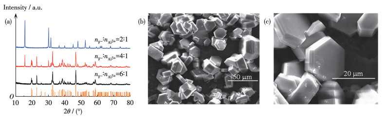 萃余液中的F-与Al3+,可以通过外加氟化钠并调节溶液pH的方式来制备冰晶石。根据溶液中的Al3+和F-浓度,加入不同含量的NaF来调节氟铝的物质的量之比,用NaOH调节溶液至pH=5,在70 ℃反应30 min,得到的结晶产物为不同氟铝比下形成的冰晶石沉淀,其XRD图和SEM图如图 9所示。