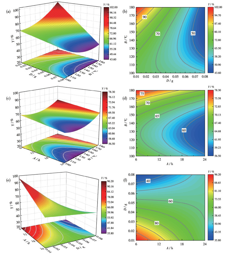 $ \begin{aligned} Y= & 79.04-2.41 A-1.23 B+146.36 C+843.86 D+ \\ & 42.87 A D+0.49 B C-8.17 B D-93.098 C D+ \\ & 0.0046 B^2-86.27 C^2 \end{aligned} $ (2) 其中,该模型不仅量化了各因素的主效应,还解析因素间的交互作用,为工艺参数的优化调控提供了可靠的理论依据。