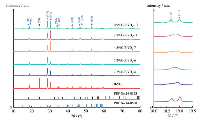 XRD分析(图 2)揭示了C-BiVO4晶体结构的变化。少量碳含量的增加使得24.41°处四方相BiVO4(PDF No.14-0133)特征峰逐渐消失,同时18.95°、28.86°、30.62°处单斜相BiVO4(PDF No.14-0688)衍射峰增强,表明碳掺杂促使了四方相向单斜相的转变,这种相变优化了晶格结构。特别是,0.9%C-BiVO4-10样品中(110)晶面衍射强度增强,这与响应面模型预测的结果一致,即在适宜温度下,低葡萄糖加入量同样有助于提升晶体的结晶度。此外,XRD图显示,当葡萄糖加入量超出最佳范围时,衍射峰宽化且强度下降,表明过量碳掺杂导致BiVO4晶格结构畸变和结晶度降低。这一结构演变趋势与RSM辅助正交实验中确定的葡萄糖加入量为最显著影响因素相吻合,从晶体结构角度揭示了碳掺杂量对BiVO4相结构和晶体完整性的调控作用。