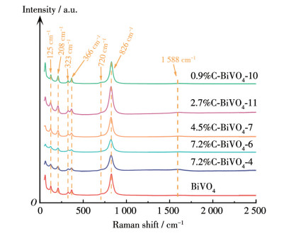图 3进一步探究了碳掺杂量对BiVO4晶体结构的调控作用。掺杂量为0.9%和2.7%时,826 cm-1处的BiVO4对称V—O拉伸峰和720 cm-1处的非对称V—O键拉伸峰强度增强。此外,随着碳掺杂量的增加,在1 588 cm-1处逐渐出现碳材料的G峰,证实了碳的成功引入。然而,过量碳掺杂导致323和366 cm-1处VO43-四面体振动峰强度减弱,表明晶体对称性被破坏[28]。这些拉曼光谱特征变化揭示了碳掺杂对BiVO4晶体结构的双重影响:适量掺杂能够增强特征峰强度,优化晶体结构;而过量掺杂则会干扰VO43-四面体的振动模式,降低晶体对称性。