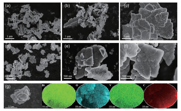 图 4揭示了碳掺杂量对BiVO4形貌演变的决定性影响,为响应面模型中各因素交互作用提供了直观证据。纯BiVO4(图 4a)呈现不规则颗粒与立方体混合形貌,对应的XRD图中检测到了四方相和单斜相共存。随着葡萄糖含量的增加,BiVO4的形貌逐渐变为更加规则的大面积片状结构,且片状的边缘更加清晰。这种形貌变化主要归因于葡萄糖在反应过程中通过吸附作用选择性附着在BiVO4的(110)晶面上,减缓了该晶面的生长速率,促进其他晶面的横向扩展,使晶体在二维方向上的生长更加显著,最终形成规则的片状结构[29]。具体而言,0.9%C-BiVO4-10(图 4b)呈现出由颗粒态向片层结构过渡的中间形貌。2.7%C-BiVO4-11样品(图 4c、4d)展现出均匀的片状结构,低倍SEM图(图 4c)显示其表面由大量交织的片状单元构成三维网络,高倍图像(图 4d)进一步揭示片层间存在有序堆叠和交联。当碳掺杂量提高至4.5%(图 4e),片状结构明显增厚并且边缘逐渐模糊。掺杂量达7.2%(图 4f)时,发生结构碎片化并出现团聚现象,导致反应活性位点减少。图 4g为能量色散X射线谱(EDS)元素映射图,图中Bi、O、V、C元素分布均匀,表明碳成功掺杂。与未掺杂BiVO4相比,适量碳掺杂形成规则片状结构,有效增大了材料的比表面积,为光催化反应提供了更多活性位点;片层间构建的三维网络结构也有利于反应物传质,提升了光生载流子的分离效率。然而,过量碳掺杂所引起的片层结构畸变和团聚会引入无序区域,反而促进载流子复合。这一演变趋势映射了图 1a中的“山脊型”,进一步表明适宜的碳掺杂量有利于晶体的完整性和结晶程度,也证实了形貌调控是碳掺杂增强光催化活性的关键机制之一。