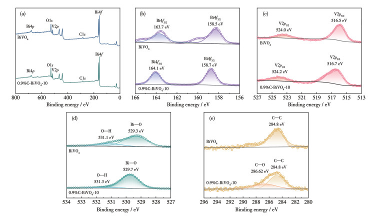 通过XPS分析了BiVO4及掺杂后BiVO4的表面元素组成和化学价态,高分辨XPS谱图清晰地显示了各元素的典型自旋轨道峰(图 5)。从图 5a中可以看到,样品中存在Bi、V、O和C元素。根据图 5b,在BiVO4中Bi4f7/2和Bi4f5/2的结合能分别从158.5和164.3 eV偏移至158.8和164.6 eV,说明Bi原子周围电子云密度发生改变[30],并且结合能向更高的方向偏移,这表明在掺杂后的催化剂中,铋元素携带更强的正电荷,并倾向于过渡到稳定的氧化态。Bi—O键的存在由结合能为529.3和531.1 eV的2个峰证实(图 5c),分别对应于晶格氧(M—O)和表面吸附氧(—OH)[31]。然而,在531.8 eV处没有观察到属于O1s的峰,表明没有产生氧空位。图 5d中,V2p3/2和V2p1/2的结合能也发生了类似图 5b的偏移。图 5e为C1s的高分辨XPS谱图,0.9%C-BiVO4-10中284.8 eV处的特征峰对应于表面吸附的非极性碳(C—C键),286.6 eV处的峰归属于C—O键,在其余位置没有观察到碳元素的其他特征峰[32-33]。与纯BiVO4相比,0.9%C-BiVO4-10中Bi4f、V2p3/2和O1s的结合能均向更高的结合能方向偏移,表明原子周围的电子云密度降低,这很可能是由于电负性较高的碳原子以含氧官能团的形式掺杂进入BiVO4晶格间隙,C—O键吸引周围原子形成更强的共价键,从而改变了Bi、V和O的局域电子环境。这一电子结构变化与响应面分析揭示的温度和葡萄糖加入量交互作用密切相关,解释了为何在特定温度和葡萄糖加入量组合下,样品能获得最优的光催化性能。XPS结果还证实了碳掺杂引入的电子结构调控是正交实验中因子D显著影响的微观机制。