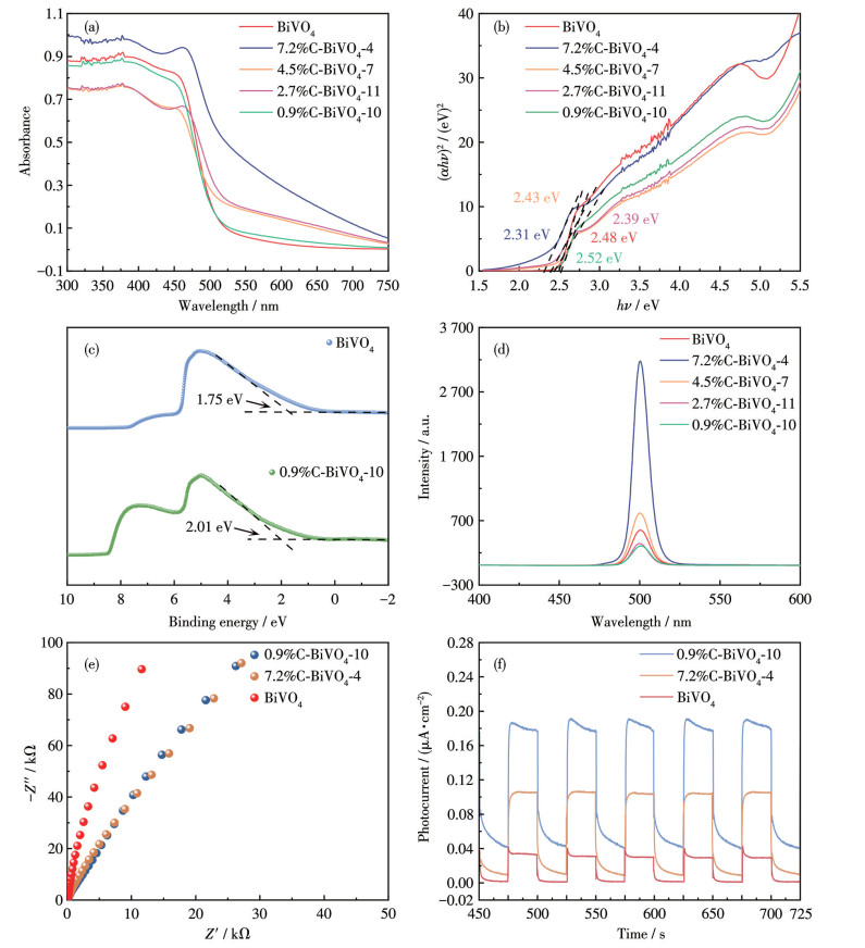 图 6 BiVO4和xC-BiVO4-y的(a) UV-Vis DRS和(b) 外推能带谱; (c) BiVO4和0.9%C-BiVO4-10的XPS-VB光谱图; BiVO4和xC-BiVO4-y的(d) PL光谱、(e) EIS和(f) I-t曲线