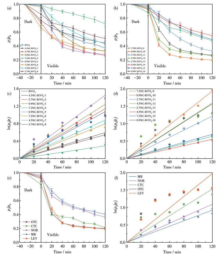 Figure 7 (a, b) Photodegradation curves and (c, d) pseudo-first-order reaction kinetic curves of BiVO4 and xC-BiVO4-y; (e) Photodegradation curves and (f) pseudo-first-order reaction kinetic curves for different pollutants of 0.9%C-BiVO4-10