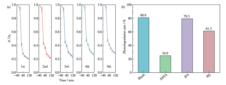 在循环实验中,每次降解反应结束后,降解溶液经高速离心、多次水洗和醇洗、烘干处理得到光催化剂,并重复使用4次,根据每次降解后抗生素污染物的浓度变化差异来评价催化剂的循环使用性能。自由基捕获实验中分别用乙二胺四乙酸(EDTA,2 mmol·L-1)、异丙醇(IPA,10 mmol·L-1)和对苯醌(BQ,0.1 mmol·L-1)作为h+、·OH和·O2-的捕获剂进行检测,探究复合材料的光催化机理。