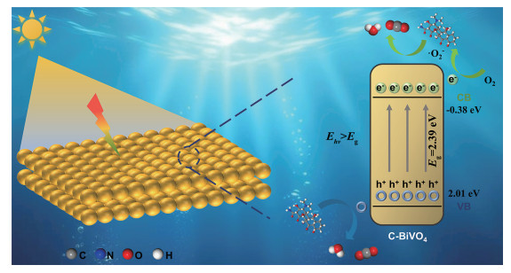 四环素(TC)作为使用最广泛的抗生素之一,具有难降解性和潜在的生态毒性,传统污水处理工艺难以有效将其去除,因此开发高效、环保的TC降解技术至关重要[1-3]。半导体光催化技术因其环境友好性和高效氧化能力,在有机污染物降解领域展现出巨大的潜力[4-6]。该技术可以产生具有较强氧化性的活性物种,包括空穴(h+)、羟基自由基(·OH)和超氧自由基(·O2-),能有效分解难降解的有机污染物。在众多可见光响应的催化剂中,钒酸铋(BiVO4)因其适宜的带隙(2.4 eV)、良好的化学稳定性和无毒害等优点,成为了近年来的研究热点[7-10]。然而,纯BiVO4存在光生电子(e-)-h+对易复合、可见光响应范围有限等缺点,从而限制了其实际应用。