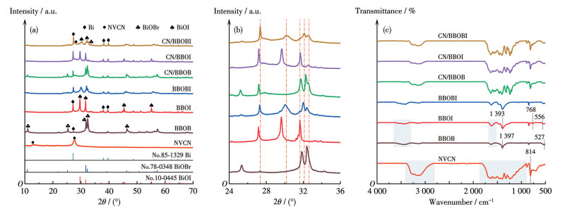 图 1. 所制备样品的(a) XRD图和(b) 24°~36°范围内的局部放大图及(c) FTIR谱图Figure 1. (a) XRD patterns and (b) the magnified patterns in the range of 24°-36°, and (c) FTIR spectra of the prepared samples图 1c为各样品的FTIR谱图。NVCN的FTIR谱图中,814 cm-1处尖锐的特征吸收峰对应三均三嗪环的面外弯曲振动模式,1 700~1 200 cm-1范围内的吸收峰是由CN杂环中C—N和C=N—C键的伸缩振动产生的,3 400~2 800 cm-1范围内较宽的吸收峰则起源于氨基和羟基基团的伸缩振动[31]。BBOB的FTIR谱图中,1 397和527 cm-1处的吸收峰分别对应Bi—Br键的非对称伸缩振动和Bi—O键的对称伸缩振动[32];对于BBOI,位于1 393、768和556 cm-1的吸收峰分别源于I—Bi—O、I—O和Bi—O键的伸缩振动[33-34]。两者的FTIR谱图中,3 600~3 300 cm-1和1 700~1 500 cm-1范围内较宽的特征吸收带分别归属于表面吸附羟基基团的伸缩振动和弯曲振动模式[32]。CN/BBOB、CN/BBOI和CN/BBOBI的FTIR谱图与NVCN类似,同时可以观察到BBOB和BBOI较微弱的特征吸收峰。在酸性的反应条件下,NVCN表面的氨基和羟基基团解离到溶液中,为BBOB和BBOI的原位生长提供活性位点。因此,CN/BBOB、CN/BBOI和CN/BBOBI的FTIR谱图中,氨基和羟基基团的吸收峰强度明显低于NVCN。