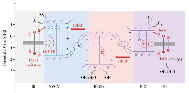 根据XPS测试结果,NVCN、BiOBr和BiOI三者接触后,NVCN和BiOI的自由电子向BiOBr转移,在NVCN和BiOI一侧形成正空间电荷区域,在BiOBr一侧则形成负空间电荷区域,从而产生由NVCN、BiOI指向BiOBr的界面内建电场(interface built-in electric field,IBIEF);同时,NVCN和BiOI的能带边缘向上弯曲,BiOBr的能带边缘则向下弯曲。在IBIEF和能带弯曲的作用下,BiOBr的光生电子和NVCN、BiOI的光生空穴在界面复合,形成双S型电荷转移机制[64-66],具有强氧化还原能力的光生电子和空穴被保留。