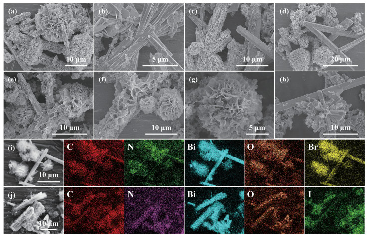 在CN/BBOB(图 2e、2f)和CN/BBOI(图 2g、2h)的SEM图中,纳米棒和纳米花表面可以观察到不规则纳米片的存在,该形貌归属于NVCN。CN/BBOB和CN/BBOI的SEM图及对应的元素映射图如图 2i、2j所示。CN/BBOB由C、N、Bi、O和Br元素组成,CN/BBOI中包含C、N、Bi、O和I元素。从图中可以看出,C、N元素的分布与Bi、O、Br和I元素的分布高度重叠,表明NVCN与BBOB和BBOI复合良好。