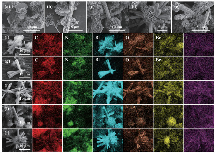 如图 3a~3e所示,CN/BBOBI同样由不规则纳米片、纳米棒及由纳米片自组装形成的纳米花3种形貌组成,与CN/BBOB和CN/BBOI的微观形貌一致。选择不同的形貌和位置进行元素组成分析,对应的SEM图和元素映射图如图 3f~3i所示。从图中可以看出,CN/BBOBI由C、N、Bi、O、Br和I元素组成,各元素分布清晰且与形貌保持一致。C、N元素的分布轮廓与Bi、O、Br和I元素基本相同,进一步证实了NVCN与BBOBI成功复合成多元异质结材料。