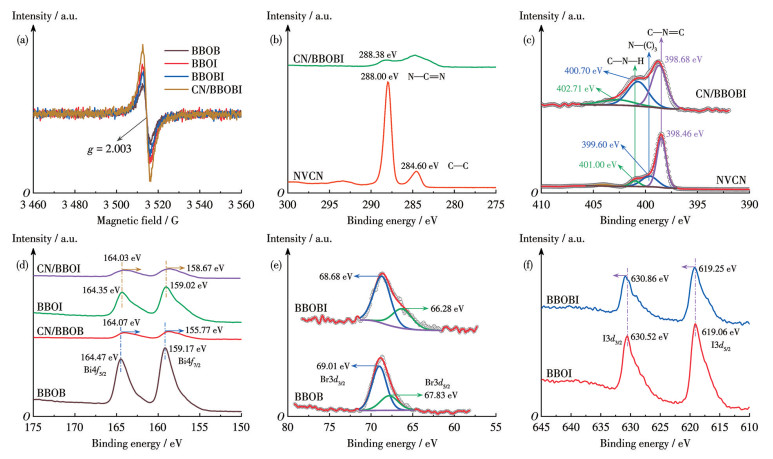 通过样品中各元素结合能的变化判断界面极化电荷的转移方向。如图 6b所示,NVCN的C1s XPS谱图中,284.60和288.00 eV处的特征峰分别归属于C—C和N—C=N键[44]。与BBOBI耦合后,N—C=N键的结合能增大至288.38 eV。图 6c为NVCN和CN/BBOBI的高分辨N1s XPS谱图。对于NVCN,C—N=C、N—(C)3和C—N—H键的特征峰分别位于398.46、399.60和401.00 eV处;与NVCN相比,CN/BBOBI中N元素的特征峰向高结合能方向偏移。如图 6d所示,由于样品中Bi3+、Bi(3-x)+和Bi0共存,BBOB、BBOI、CN/BBOB和CN/BBOI的Bi4f XPS谱图中可以观察到2个非对称的特征峰[45-46]。由图可知,BBOB和BBOI与NVCN复合后,Bi元素的特征峰向低结合能方向偏移。结合能增大代表电子云密度减小[47-48],即NVCN与BBOBI复合后,极化电荷由NVCN向BBOBI转移,电子在BBOBI一侧累积,促进了正电性氧空位的形成,导致CN/BBOBI中氧空位浓度增大[49]。