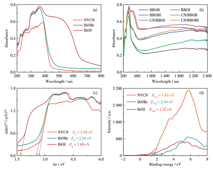 图 7 (a) NVCN、BiOBr和BiOI的UV-Vis DRS; (b) BBOB、BBOI、BBOBI、CN/BBOB、CN/BBOI和CN/BBOBI的UV-Vis-NIR DRS; NVCN、BiOBr和BiOI的(c) Kubelka-Munk转换曲线和(d) XPS-VB谱图