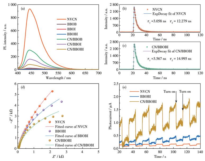 Figure 9 (a) PL spectra of the prepared samples; TRPL spectra of (b) NVCN and (c) CN/BBOBI; (d) EIS and (e) transient photocurrent response curves of NVCN, BBOBI, and CN/BBOBI under visible light irradiation