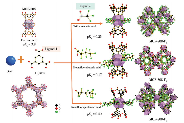 To effectively enhance the C2H2 selectivity of MOF-808, we consider employing a series of auxiliary fluorinated ligands to systematically narrow the pore size of MOF-808 as well as creating a hydrogen-bonding-favored inner environment to enhance the affinity of C2H2[18-20]. A series of perfluoroalkyl acids with different chain lengths, including trifluoroacetic acid, heptafluorobutyric acid, and nonafluoropentanoic acid, was introduced in MOF-808 as the auxiliary ligands (Fig. 1). As the length of perfluoroalkyl acids increased, the pore sizes of functionalized-MOF-808 samples gradually decreased, which aligned with our experimental expectations. According to the Hard-Soft acid-base (HSAB) theory, weaker acids can be replaced by stronger acids. Specifically, formic acid has a pKa of 3.8, while trifluoroacetic acid, heptafluorobutyric acid, and nonafluoropentanoic acid have pKa values of 0.23, 0.17, and 0.40, respectively[21]. Therefore, perfluoroalkyl acids of varying chain lengths can replace the formate residue coordinated to the Zr6 nodes in MOF-808, resulting in a series of perfluoroalkane-functionalized MOF-808-R materials (where R=F3, F7, and F9, corresponding to trifluoroacetic acid, heptafluorobutyric acid, and nonafluoropentanoic acid). We conducted gas adsorption tests for C2H2 and CO2 on MOF-808-R with different perfluoroalkyl acids, and the results showed that MOF-808-F7 exhibited the highest selectivity of C2H2 adsorption against CO2 among all the analogues including the original MOF-808 material, indicating that MOF-808-F7 is a suitable material for C2H2/CO2 separation.
