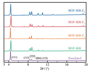 The structural integrity of these MOF-808 modified samples was confirmed by XRD pand SEM. As demonstrated in Fig. 2, the five characteristic diffraction peaks of the synthesized MOF-808 (observed at 2θ=4.3°, 8.3°, 8.7°, 10.0°, and 10.9°) showed good agreement with the simulated peak positions of MOF-808. Furthermore, the XRD patterns of MOF-808 functionalized with perfluoroalkyl acids of varying chain lengths showed no significant deviation from the pristine framework, confirming that the post-synthetic modification process preserves the crystallographic integrity of the parent structure. Further morphological analysis was conducted by SEM. As shown in Fig. 3a, MOF-808 exhibited apparent octahedral morphology, consistent with previously reported microstructures[27], and the particle size was relatively uniform (1-2 μm). The modified MOF-808-R (R=F3, F7, F9) samples, as shown in Fig. 3b-3d, indicated that the introduction of perfluoroalkyl acids did not alter the morphology or size of the original MOFs. The preservation of crystal integrity post-modification further highlights the stability of the framework, making it a promising candidate for advanced functionalization strategies.
