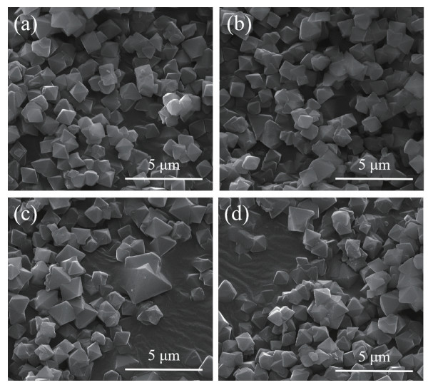 Figure 3  SEM images of (a) MOF-808, (b) MOF-808-F3, (c) MOF-808-F7, and (d) MOF-808-F9