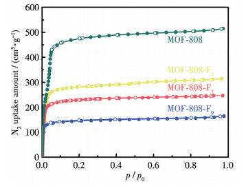 The N2 adsorption-desorption isotherms of these perfluoroalkate-functionalized MOF-808 samples were further collected. As shown in Fig. 4, the saturated uptake amount of N2 for these MOF-808 samples decreased progressively from 510 cm3·g-1 for MOF-808 to 310 cm3·g-1 for MOF-808-F3, 230 cm3·g-1 for MOF-808-F7, and 150 cm3·g-1 for MOF-808-F9. We then calculated the BET (Brunauer-Emmett-Teller) surface areas (SBET, Table 1) for the four samples (MOF-808: 2 091 cm2·g-1, MOF-808-F3: 1 379 cm2·g-1, MOF-808-F7: 682 cm2·g-1, and MOF-808-F9: 450 cm2·g-1). The pore volumes of the four samples were as follows: MOF-808 (0.78 cm3·g-1), MOF-808-F3 (0.48 cm3·g-1), MOF-808-F7 (0.36 cm3·g-1), and MOF-808-F9 (0.23 cm3·g-1). As shown in Fig.S7, the pore sizes also gradually decreased (MOF-808: 2.17 nm, MOF-808-F3: 1.63 nm, MOF-808-F7: 1.44 nm, and MOF-808-F9: 1.42 nm). The increasing length of perfluoroalkylate gradually reduces the pore size of MOF-808, leading to a decrease in the available surface area for gas adsorption.