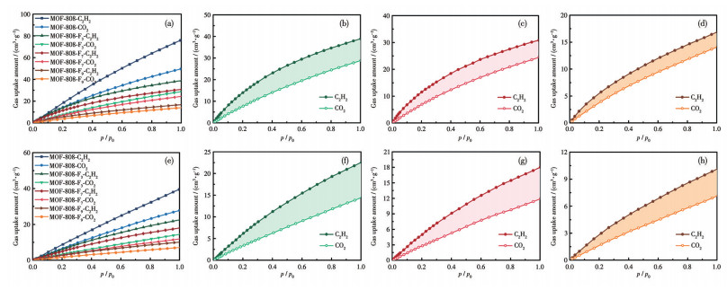 Figure 5  Adsorption isotherms of C2H2 and CO2 at (a) 273 K and (e) 298 K for MOF-808 and MOF-808-R; Adsorption isotherms of C2H2 and CO2 for (b) MOF-808-F3, (c) MOF-808-F7, and (d) MOF-808-F9 at 273 K; Adsorption isotherms of C2H2 and CO2 for (f) MOF-808-F3, (g) MOF-808-F7, and (h) MOF-808-F9 at 298 K