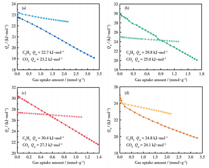 Figure 6  Isosteric heats of adsorption of (a) MOF-808, (b) MOF-808-F3, (c) MOF-808-F7, and (d) MOF-808-F9 for C2H2 and CO2