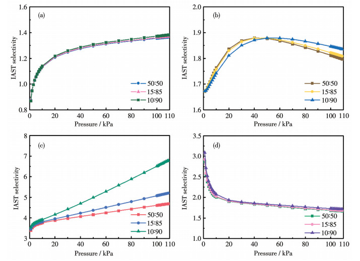 where p (kPa) represents equilibrium gas pressure, q (mol·kg-1) represents adsorption capacity per unit mass of adsorbent, qm1 and qm2 (mol·kg-1) represent saturation capacities of site 1 and site 2, b1 and b2 (kPa-1) represent affinity constants of site 1 and site 2, n1 and n2 represent deviation coefficients for an ideal adsorption surface, respectively. For the IAST equation: