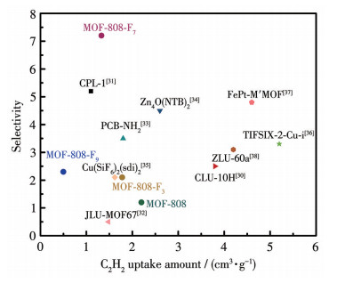 Figure 8  Comparison of separation selectivity of C2H2 and CO2 from common materials (C2H2/CO2: 90∶10)[30-38]
