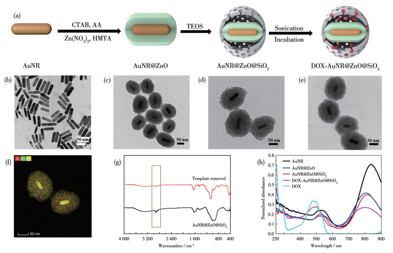 图 1 DOX-AuNR@ZnO@SiO2的制备示意图; 不同纳米材料的透射电子显微镜(TEM)图: (b) AuNR、(c) AuNR@ZnO、(d) AuNR@ZnO@SiO2、(e) DOX-AuNR@ZnO@SiO2; (f) AuNR@ZnO@SiO2的TEM元素映射图; (g) AuNR@ZnO@SiO2去模板前后的傅里叶红外谱图; (h) 不同纳米材料的紫外可见吸收光谱