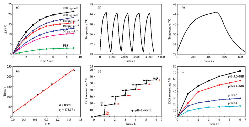 图 2 室温下不同浓度的DOX-AuNR@ZnO@SiO2溶液用808 nm NIR激光(1 W·cm-2)光照的温度变化曲线; (b) DOX-AuNR@ZnO@SiO2(200 μg·mL-1)在激光照射下的温度循环曲线; (c) 200 μg·mL-1的DOX-AuNR@ZnO@SiO2溶液在光照9 min后的温度冷却曲线; (d) DOX-AuNR@ZnO@SiO2的光热转换的时间常数; (e) 在pH=7.4溶液中DOX-AuNR@ZnO@SiO2的光热控制药物释放曲线(808 nm, 1 W·cm-2); (f) 材料在不同pH下有、无808 nm NIR光照射时的药物释放曲线