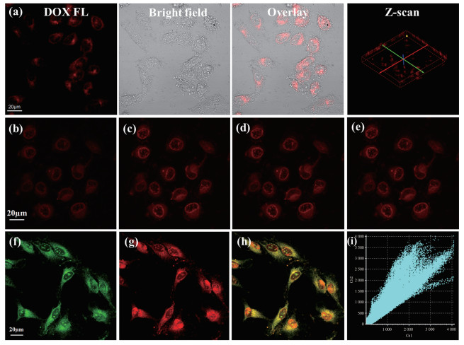 Figure 3 (a) Laser confocal microscopy images of HeLa cells cultured with DOX-AuNR@ZnO@SiO2 after illumination (λem=550-600 nm); Confocal images of HeLa cells (λem=550-600 nm) cultured with DOX-AuNR@ZnO@SiO2 (25 μg·mL-1) (b) without illumination, (c) with illumination, and after additional post-illumination culture for (d) 5 min or (e) 10 min; Confocal images of HeLa cells cultured with DOX-AuNR@ZnO@SiO2 and subsequently stained with Lysogreen: (f) green channel (λem=520-550 nm) for Lysogreen, (g) red channel (λem=550-600 nm) for DOX, (h) overlay of green and red channel; (i) Pearson′s co-staining coefficient profile