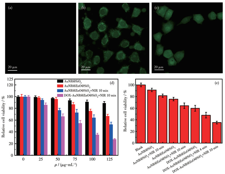 图 4 材料(25 μg·mL-1)与HeLa细胞共培养2 h后用808 nm NIR激光(1 W·cm-2)照射后, 以DCFH-DA作为细胞内ROS指示剂(绿色通道)的细胞成像: (a) AuNR@SiO2、(b) AuNR@ZnO@SiO2、(c) DOX-AuNR@ZnO@SiO2; (d) 不同质量浓度的AuNR@SiO2、AuNR@ZnO@SiO2和DOX-AuNR@ZnO@SiO2在一定条件下处理HeLa细胞的细胞存活率; (e) 不同条件下处理的HeLa细胞的细胞存活率(各材料均为100 μg·mL-1)