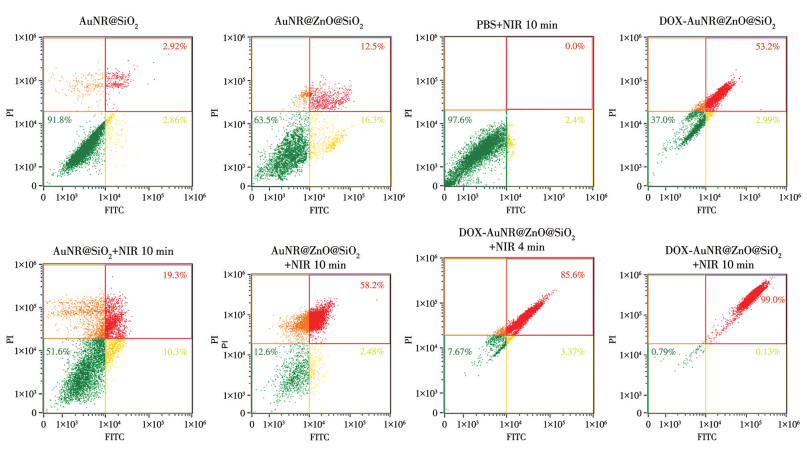 进一步,采用流式细胞术实验评估DOX-AuNR@ZnO@SiO2对HeLa细胞的光触发三模态协同治疗效果,主要使用Annexin V-FITC(FITC)和PI两者染色然后通过流式细胞术计数的细胞来分析死细胞的百分比。如图 6所示,由于AuNR的光热效果,10 min NIR光照使AuNR@SiO2对照组活细胞比例从91.8%下降到51.6%。由于ZnO可以诱导细胞产生ROS,使得AuNR@ZnO@SiO2在无NIR光照条件下依然能导致19.3%的癌细胞凋亡;同时,AuNR@ZnO@SiO2组于NIR光照射10 min后活细胞比例仅为12.6%,说明了光热治疗的良好效果。此外,光照4 min使DOX-AuNR@ZnO@SiO2对照组活细胞比例从37%下降到7.67%,表明AuNR在NIR光照射4 min吸收光能转化的热量仅能快速促进DOX的释放而未达到引发PTT的效果。NIR光照10 min导致DOX-AuNR@ZnO@SiO2处理的细胞99%以上凋亡,说明最终的DOX-AuNR@ZnO@SiO2多功能材料有着优异的联合治疗效果。与单一疗法相比,以AuNR为核心实现光热治疗、药物治疗和ROS治疗于一体的多功能纳米治疗剂在深层肿瘤治疗方面有着更好的应用前景。