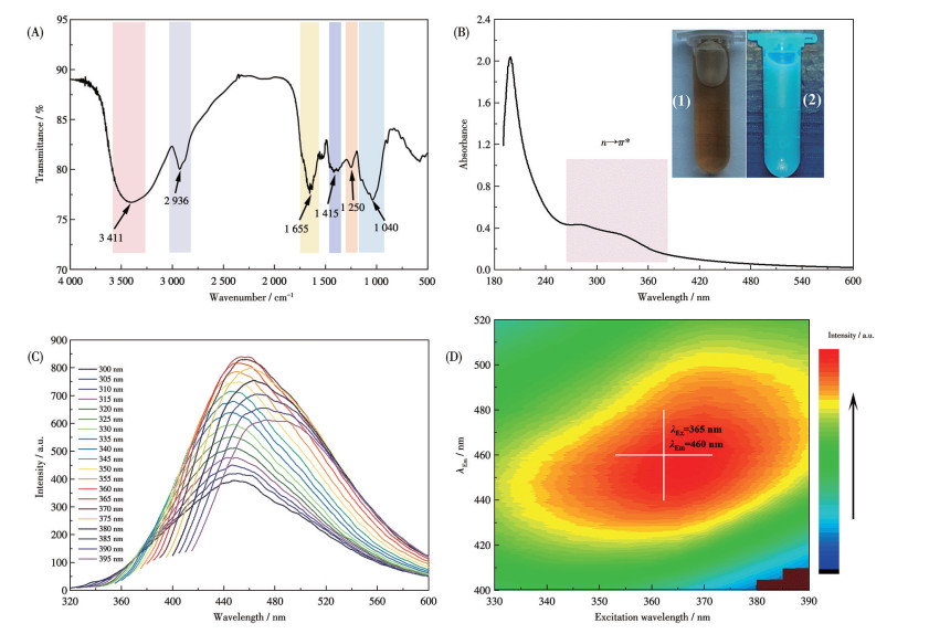图 3  vCDs的(A) FTIR谱图、(B) UV-Vis吸收光谱、(C) 不同激发波长下的荧光发射光谱和(D) 相应的3D荧光光谱