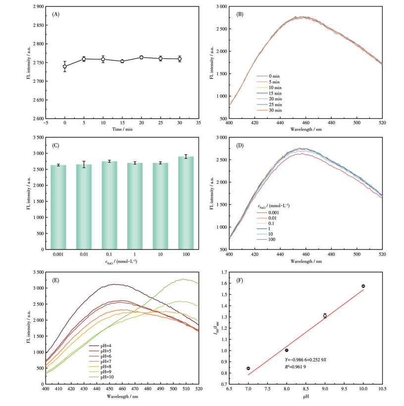 图 4  不同紫外光照射时间下vCDs的(A) 荧光强度和(B) 荧光发射光谱; 在不同浓度NaCl溶液中的vCDs的(C) 荧光强度和(D) 荧光发射光谱; (E) 在不同pH缓冲体系中vCDs的荧光发射光谱; (F) 缓冲体系pH与I505/I460的关系