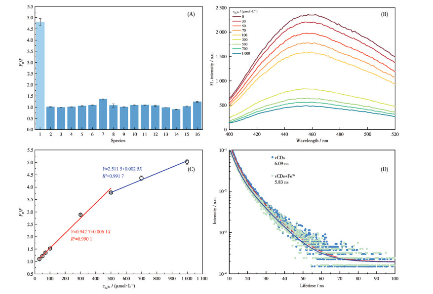 Figure 5  (A) Fluorescence quenching efficiency of vCDs with different metal ions; (B) Fluorescence emission spectra of vCDs with different concentrations of Fe3+; (C) Standard curve of vCDs for fluorescence quenching detection of Fe3+; (D) Fluorescence decay curves of vCDs with or without Fe3+